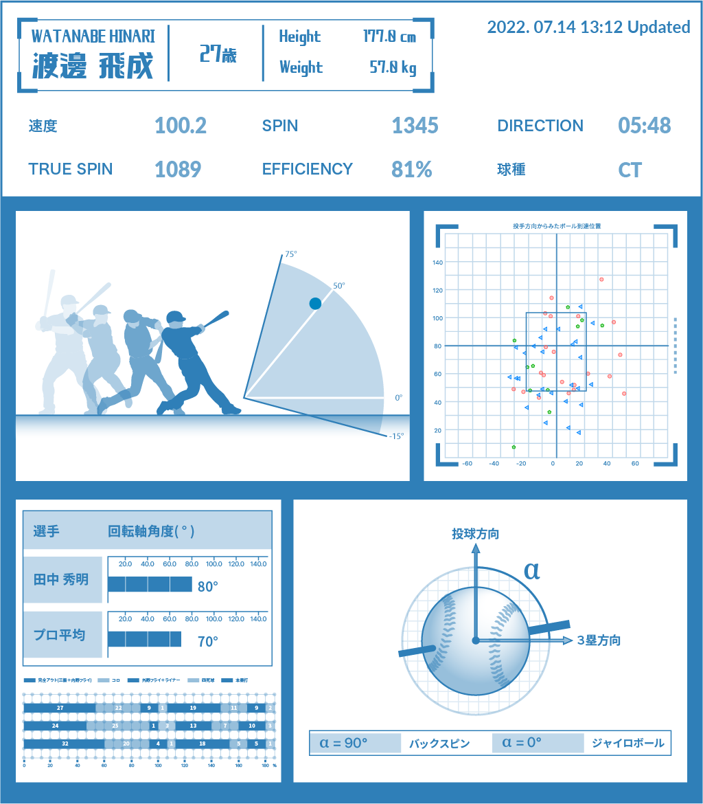 最新のトラッキング機器と体組成計を用いて、投球されたボールの球質や全身の筋肉の量などを計測します。技術・身体の2つの側面からあなたのパフォーマンスの現在地を可視化します。